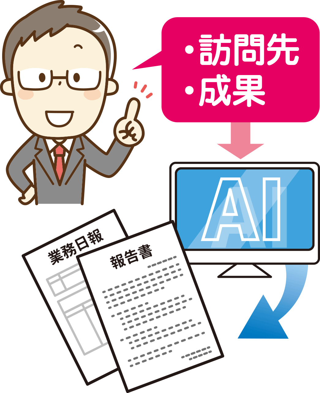 例えば営業日報。従来は「訪問先」「提案内容」「次回予定」などを毎回手書き・手入力していたかもしれませんが、今はAIに「本日の訪問先と成果」などの要点だけを伝えるだけで、読みやすい文章に整えてくれます。これなら文章が苦手な方でも安心。誰でも一定のクオリティで報告書をまとめられます。
