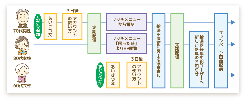 LINE公式アカウントに配信以外の利便性を求める顧客は多いようです。点検の日程変更や、器具の見積もりなど、双方向でのやり取りをユーザー様も求めています。また、HPや紙のチラシにはないLINEの友だち独自の情報があると友だち登録促進にもつながりますね。定期配信のくらしの知恵もそうですし、新聞折り込み予定のセール情報を LINEの友だちにだけ数日前に配信するのはいかがでしょうか?